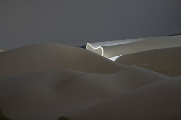 Foam fabric absorbs our dreams, the revival and the troublesome sleep. The body sinks in it and emerges like returning from the foamy waves. While using the form for the video performances outdoors this material became simply the layer, a sheet covering, hiding, protecting, and also isolating from the surroundings. Its genuine secret becomes explicit just after entering the space of video, making possible for itself (including myself) to overcome the rules of deterioration, with the aid of technical equipment looping the same sequences at the several exhibition spaces in the different places of the world. This interlacing of sculpture and video which allows the initial gesture to be compressed into a volume like a DVD disc and similarly into the lamp of Aladdin to evolve again in the form of video-projection, fascinates me through its analogy to the thought and its ability to cross the space and time.