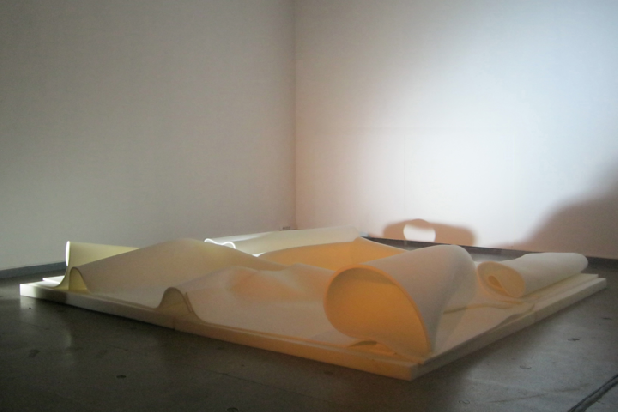 Working with the foam, I use body-oriented large-scale mats: even as the empty surfaces they imply the absence of the human body. Generally, I associate the foam surface with the skin and I also understand the landscape as the skin of the earth. Depending on the context and on the way it is placed spatially, foam also implies different social factors like poverty or comfort and can create the autonomous context in conjunction with the title, which means a parallel literary supplement and a program in my work.