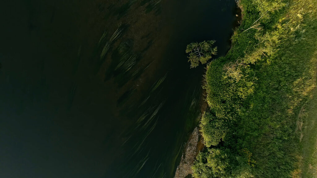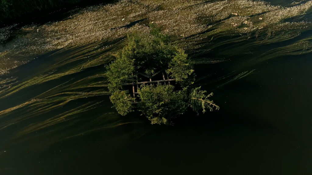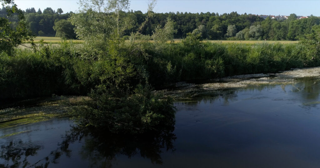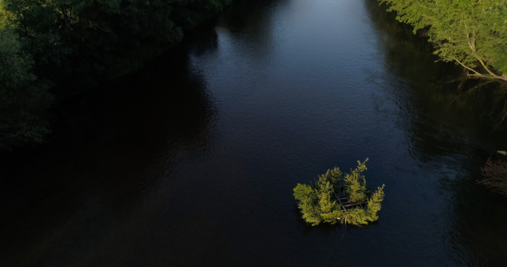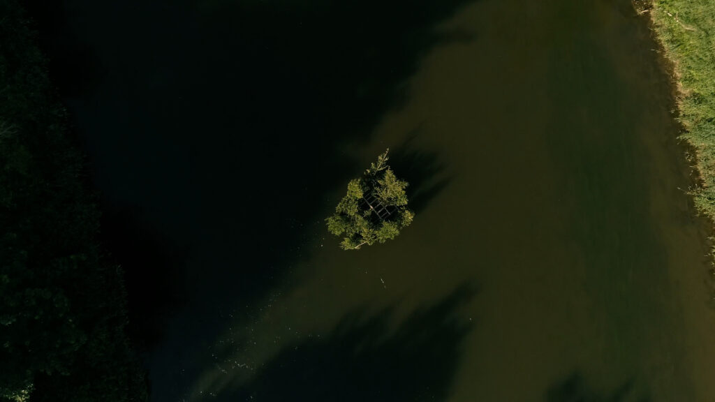 A remote, wild stretch of the Danube unfolds in new perspectives as a drone traces the river’s course. The flight offers an intimate experience of the water, capturing both its physical presence and an expanded way of seeing. Drifting along a section of the Danube belonging to the city, the sculpture transforms the river into both stage and collaborator, tracing the delicate balance between control and fluidity. By merging local, site-specific materials with global themes of movement and displacement, the project invites reflection on the ways in which nature, culture, and history are deeply intertwined. The river, a force both powerful and vulnerable, reveals its dependence on human influence, while the drifting spruces embody a landscape in transition – challenging our perception of what is fixed and what is fluid.