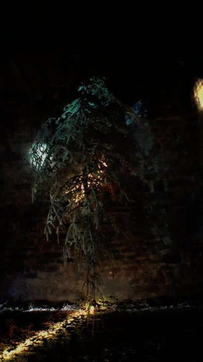 Die installative Sitaution basiert auf einem einzigen Element, einer Tanne; sie stellt diesen Baum so dar, wie er durch die Kultur(en) assimiliert, fragmentiert und reisend, in unserer Zeit der Dinge in Erscheinung tritt: als ein gefällter Baum, in einer künstlichen Lichtquelle, aus dem Kreislauf der Natur entnommen. Der Blick kann durch durch die Tannenadeln wandern, so wie das in der Natur nichz möglich wäre. Sie würden vom Wind zersteut, mit Moos, Laub und anderen Tannennadeln vermischt. So rein sortiert, nur einem einzelnen Baum gehörend, kann der Teppich nur durch die menschliche Hand entstanden sein. Der Duft jedoch, der sich im Turmraum ausbreitet, ist möglicherweise der Urduft aller Tannen.