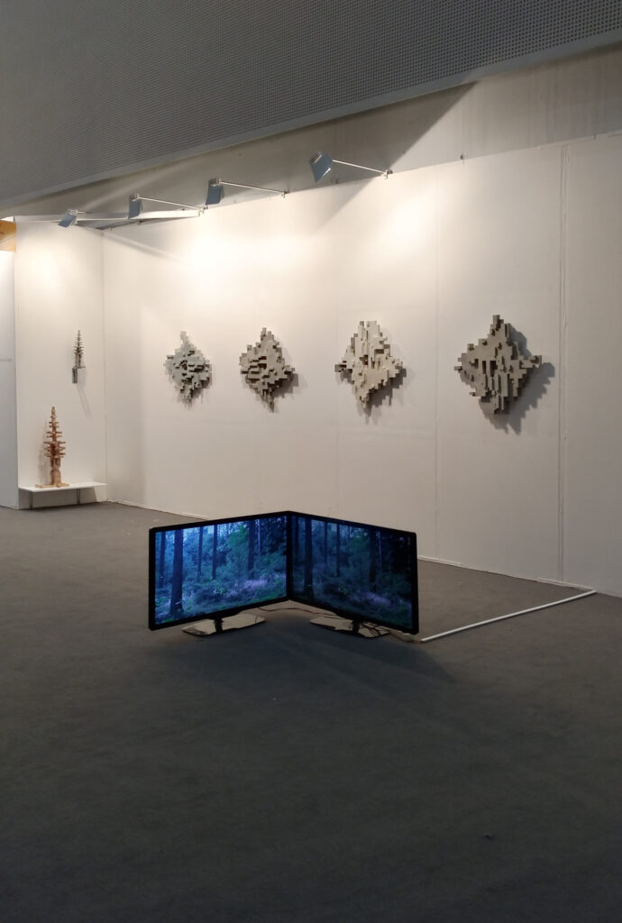 Works at art Karlsruhe include cast-pixel reliefs (SIX DOUBTS YOU SHOULD KNOW ABOUT, 2019, mortar cast, pigments, 70 × 70 × 6 cm), sculptural objects built from wooden pixels (TWINS, 2017, wood, chalk primer, 107 × 85 × 70 cm), aluminium forms (ATTITUDE_BALANCE, 2012, aluminium cast, 40 × 16 × 10 cm), and the video installation of a rotating fir tree in the forest (STILLEVEN, 2015). Together, these works reflect her key technical approaches and the conceptual concerns she explores, including the relationship between nature and civilization.