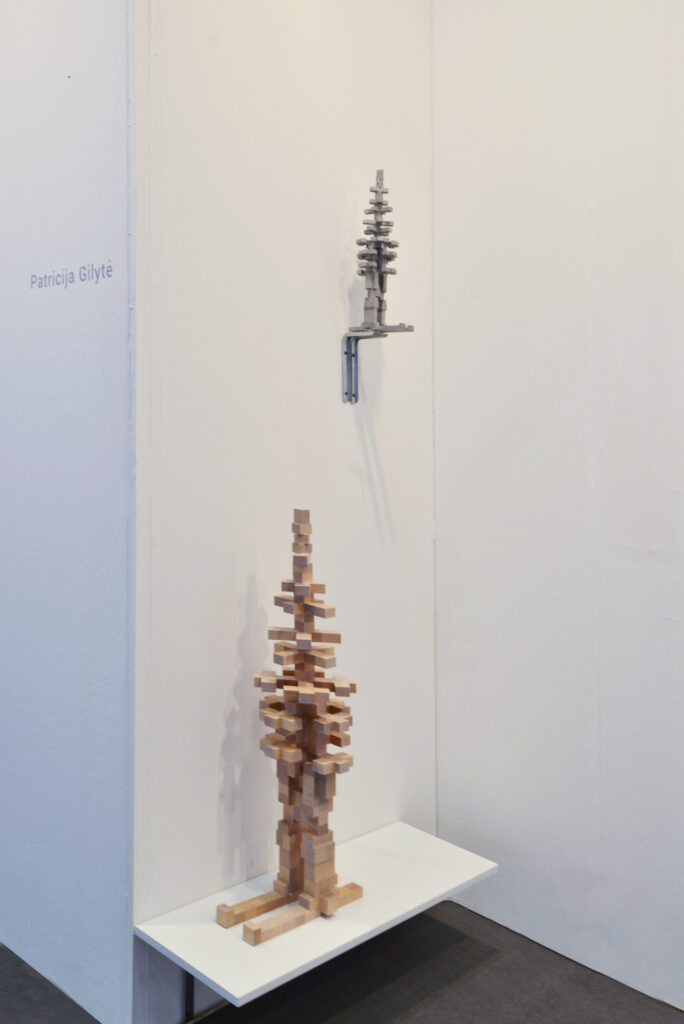 Auf der Messe gezeigten Arbeiten von Patricija Gilyte vereinen die Medien, denen sich die Künstlerin in den letzten zehn Jahren gewidmet hat: Videokunst und modulare Techniken, bei denen Skulpturen aus „Pixeln“ – standardisierten Modulen aus Materialien wie Zuckerwürfeln, Holz oder Aluminium – entstehen. Patricija Gilyte verbindet performative Skulptur, Videokunst und Installation und schafft Werke, die traditionelle und experimentelle Materialien und Techniken nahtlos verschmelzen.