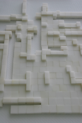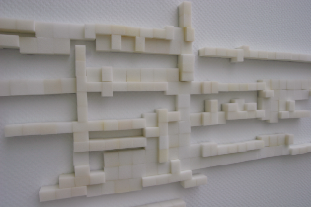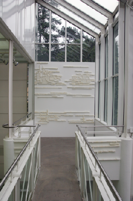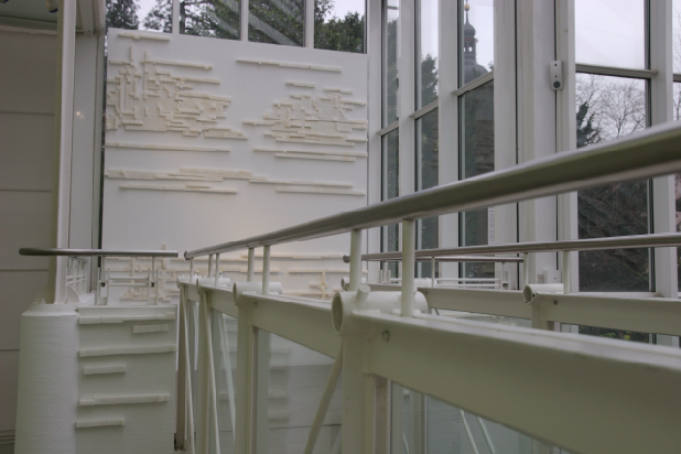 Zu sehen ist ein sogenanntes „Pixelbild“ aus weißen Schaumstoffmodulen, das nicht nur eine abstrahierte Landschaft beinhaltet, sondern auch eine ästhetisch eigenständige Skulptur darstellt. Die reliefartige Struktur gliedert sich in Horizontalen und Vertikalen, die zum einen mit der architektonischen Linienführung des Raumes in einen Dialog treten und zum anderen einen Blick auf Heidelbergs Einbettung in die Landschaft freigeben: strenge