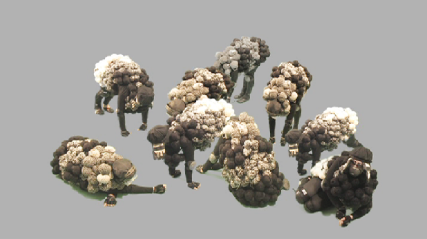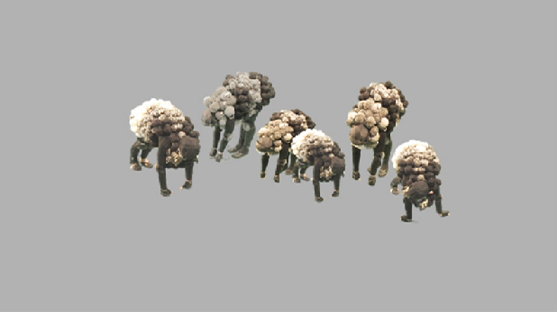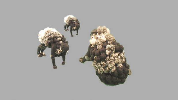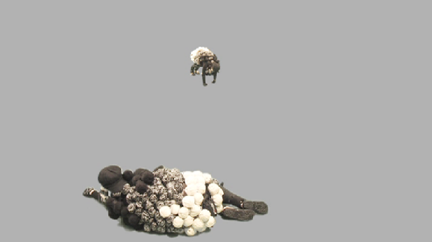 Vor einer bleigrauen Fläche ruht eine isolierte Figur, die lediglich ein blumenkohlartiges und atmendes Wesen aus gescheckten Wollknäueln andeutet. Es tauchen weitere dieser „Schafe“ auf und es bilden sich plötzlich Raumperspektiven aus der Fläche heraus. Die Schafe sind zwar in ihr behäbiges Dasein vertieft (fressen, widerkäuen, ruhen), jedoch beginnen sie in der Videoarbeit als Skulpturen formal zu interagieren. Es entwickelt sich ein kompositorisches Gefüge aus passiven Körpern, die scheinbar einem undefinierbaren Verhaltenssystem folgen.