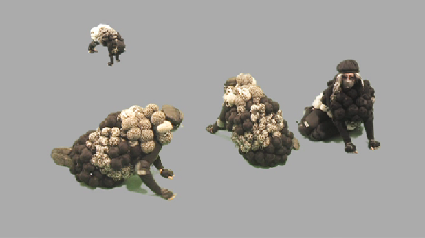 For this video work I had conceived a sheep like figure. The body (torso) is covered with the balls of wool and also protected by knee pads and gloves. By taking a closer look one can discover, that the sheep flock grazing in the grey undefined space on the video consists of the multiplicated figures resembling a sheep. Sheep have had a strong presence in many cultures, especially in areas where they form the most common type of livestock. There are also many ancient Greek references to sheep (Chrysomallos). Initially, sheep were kept solely for meat, milk and skins. Today, domestic sheep (Ovis aries) is an entirely domesticated animal that is largely dependent on man for its health and survival. Wool was one of the first textiles, until the wool prices began to fall dramatically as the result of the cheap prices for synthetic fabrics.