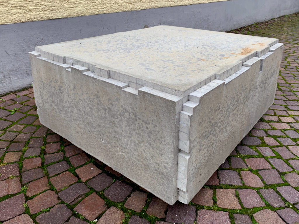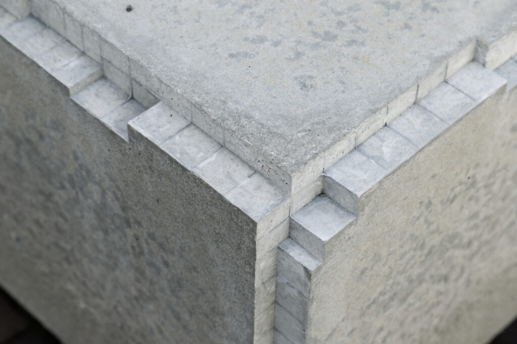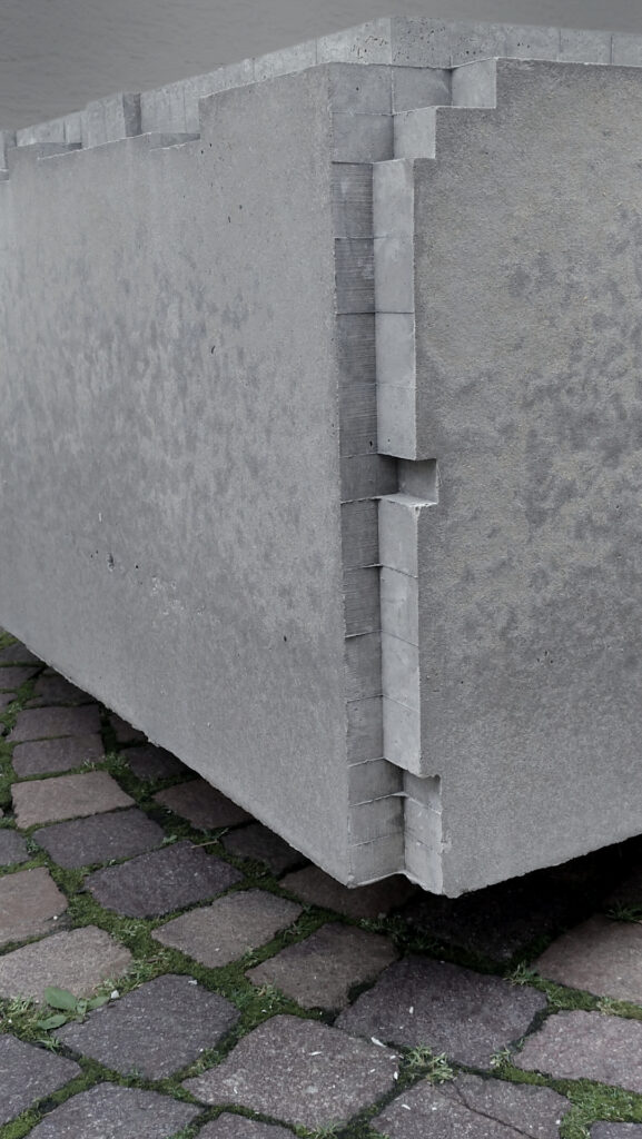 Gegossen wie ein auf den ersten Blick gewöhnlicher Quader, behielt der Guss eine fragile Außenkante, die aus Variationen kleiner, fehlender (ausgesparter) Würfelketten bestand und entlang aller Flächen verlief. Dadurch wurde das Be- und Entladen während des Transports bereits zu einem Thema für die Mitarbeiter:innen des Betonwerks, da sie darin einen versteckten Witz aufspürten und zugleich die Problematik von Betonkanten aus ihrer eigenen Erfahrung thematisierten.