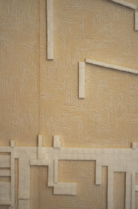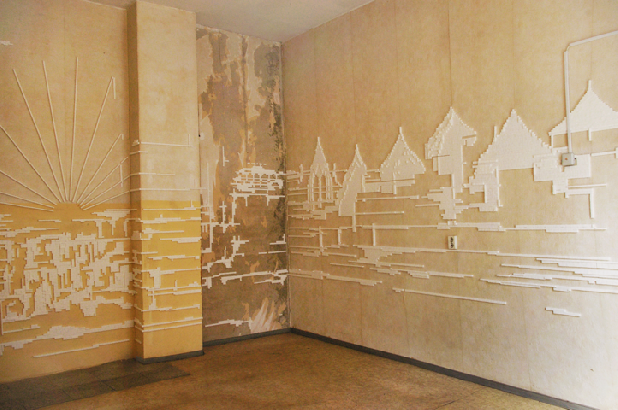 PG: Ich erarbeite ein Stadtpanorama von Chemnitz, das direkt an die Wände aus Würfelzucker zusammengesetzt wird. Das ist vergleichbar mit einer Zeichnung, aber noch mehr mit einer Kodierung, denn ich benutze keine Vorlagen wie Fotos oder technischen Geräte wie einen Overheadprojektor. Ich bringe die Bilder direkt aus dem Gedächtnis an die Wand. Verschiedene Perspektiven überlappen sich. Würfelzucker bedeutet für mich Pixel, das kleinste Element, aus dem ein digitales Bild besteht. Als Lebensmittel ist Zucker an sich etwas Wertvolles. Seine kristalline Struktur ist faszinierend und kaum in künstlichen Materialien nachbildbar. Würfelzucker symbolisiert sowohl die heutige digital erfassbare Welt, auch die Konsumgesellschaft mit Produkt- und Markenwelt, hat aber auch etwas mit dem Nachkriegszeit-Gedächtnis der älteren Generation zu tun.