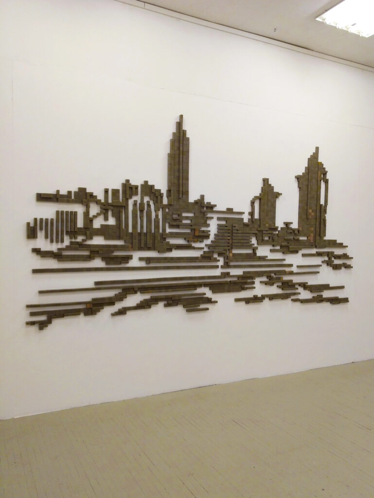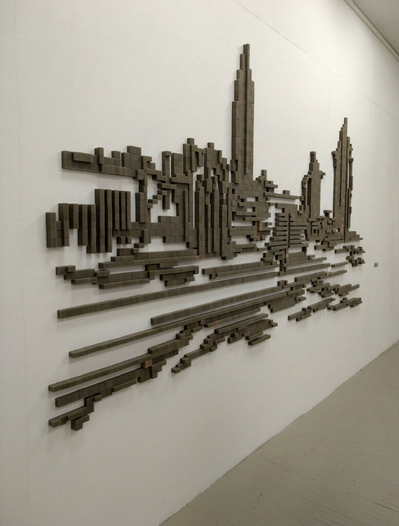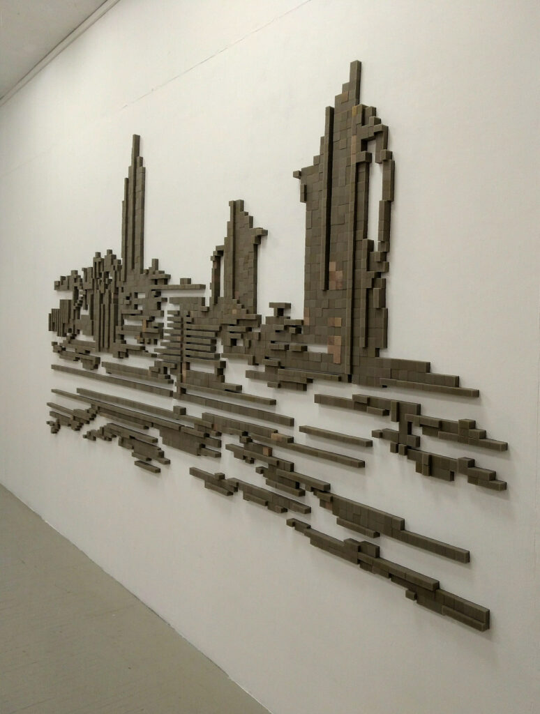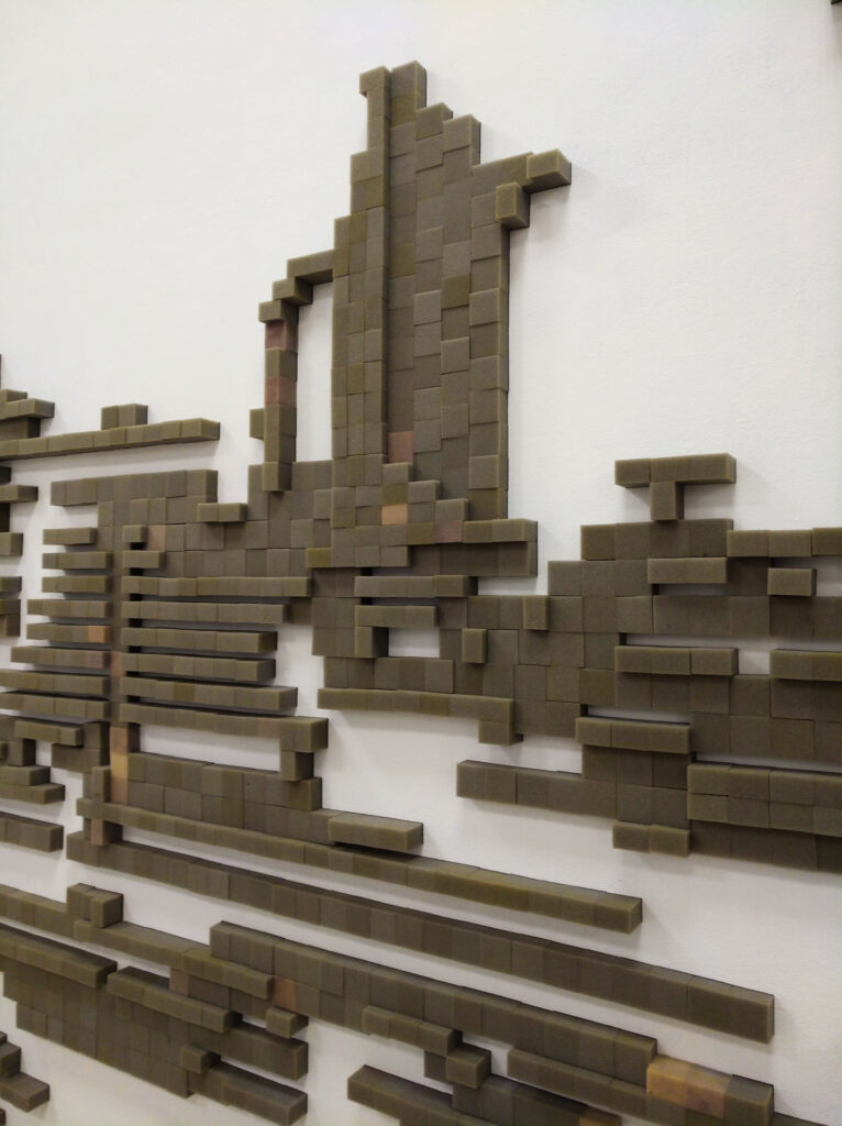 Still Life with Cans, a wall piece created in situ for this show, is a site-specific foam-pixel relief. I rebuilt significant modernist buildings of Kaunas that, over a long period of my youth, shaped my perception of architecture. In this work, I turn individual architecture into a typical still-life tableau, displaying buildings as cans.