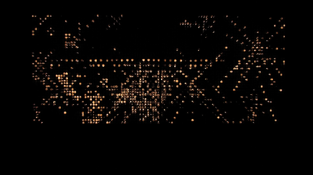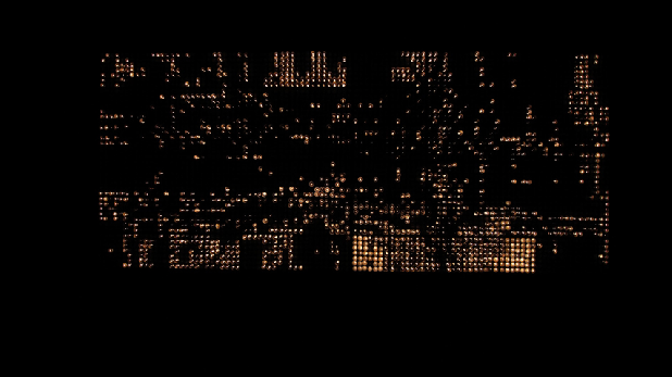 The visual story consists of separate luminous points (tea lights). They appear in a random sequence forming patterns while creating grids. The narrative of the image is reached while lighting and blowing out candles. The effect oft the variable colour changes depends on the duration of the burning; candles which burns longer become liquid and look transparent.