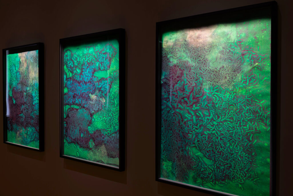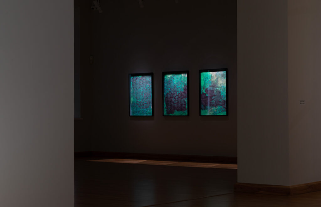 After passing through the first darkened, scent-filled room, dominated by a central battlefield relief of a fir-needle–covered plain (BATTLEFIELD OF GRUNWALD), the visitor enters a second space. On the wall directly opposite the entrance, illuminated, window-like drawings are presented. Positioned symmetrically and framed in dark wooden frames, the works invite the gaze to glide across surfaces. Intensified shades and intricate patterns unfold according to the viewer’s position, suggesting an inner cartography rather than fixed territorial borders.